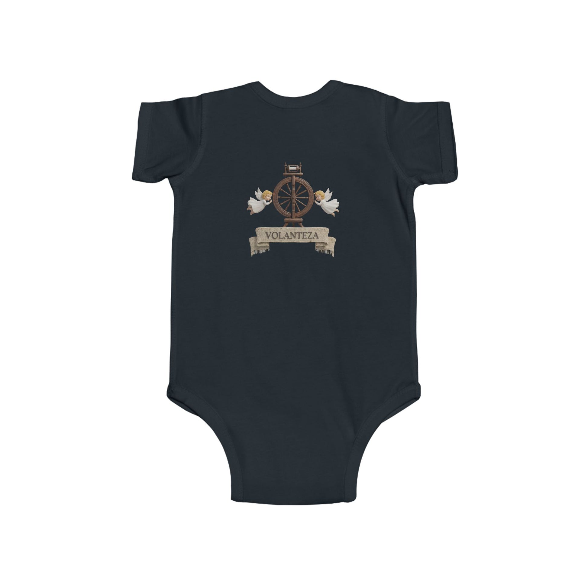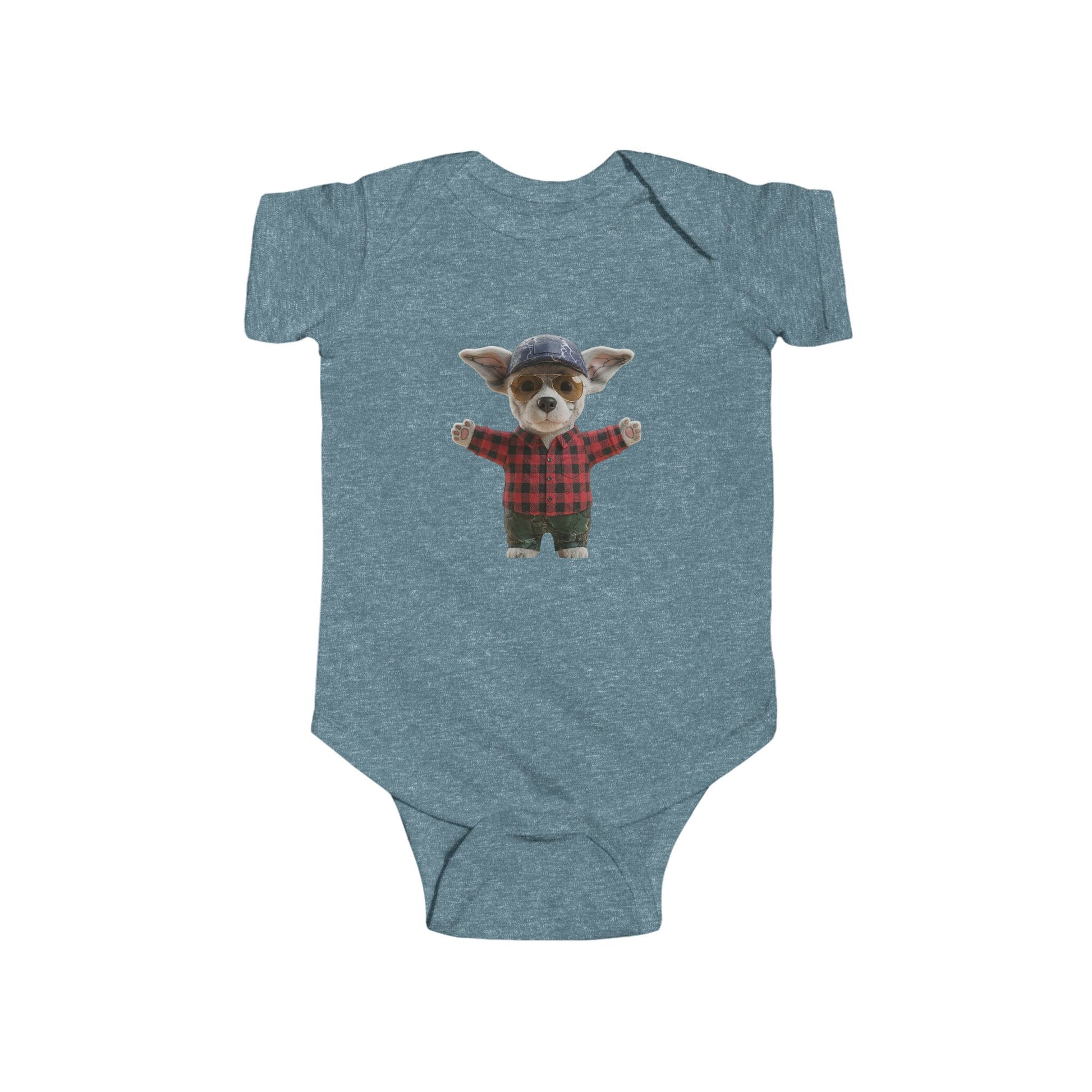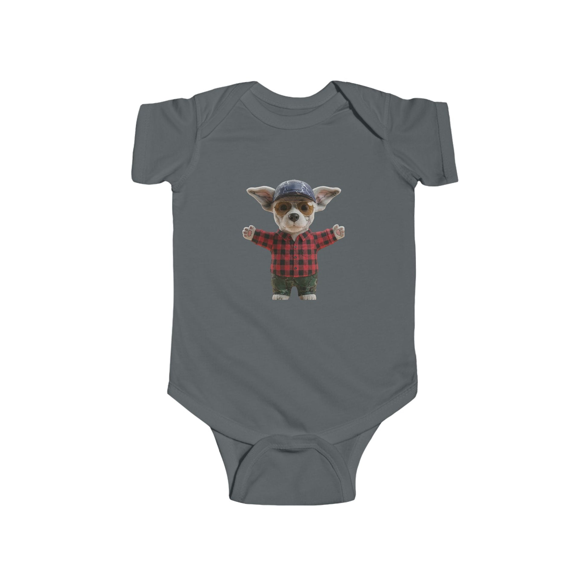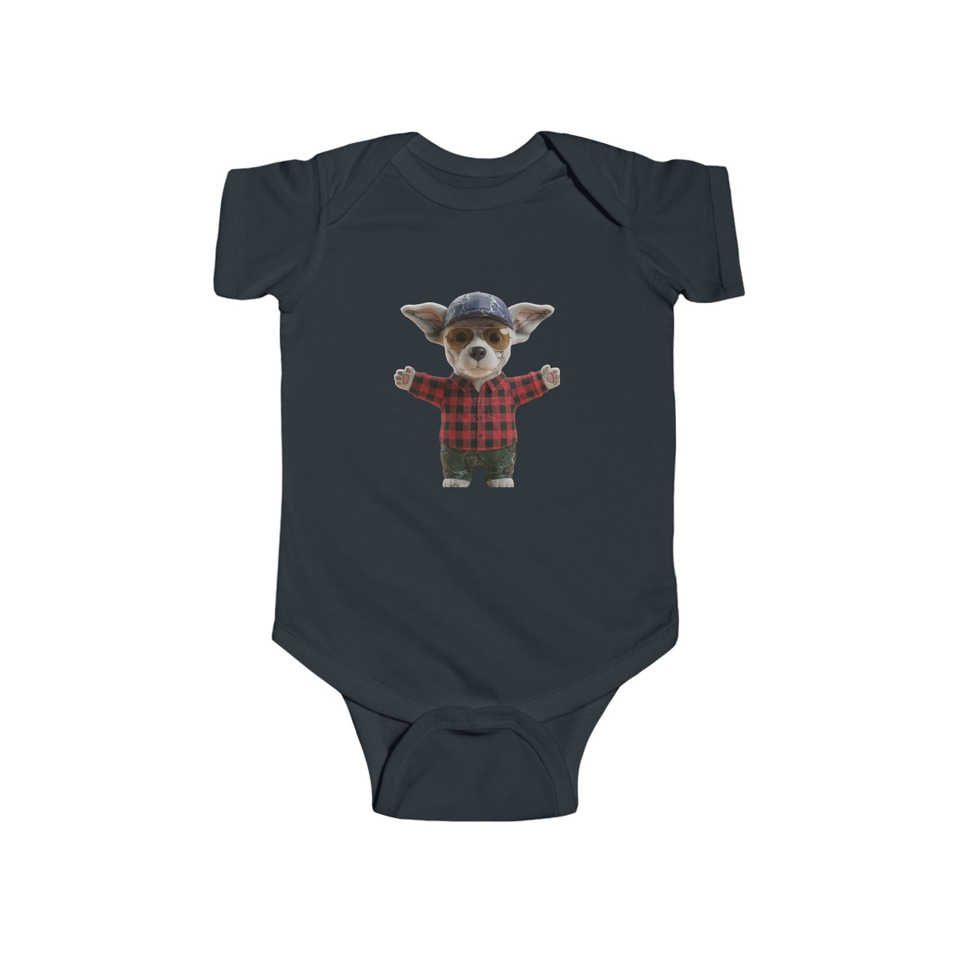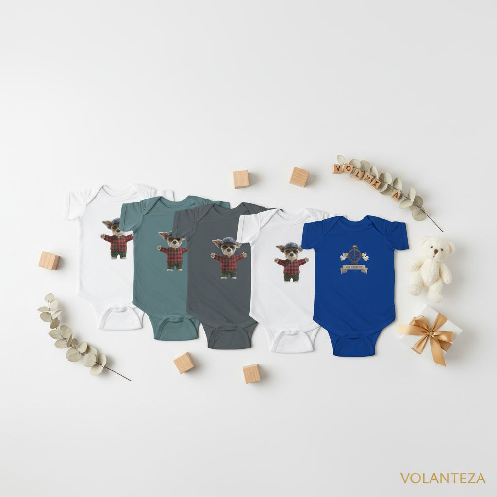 Steal hearts in this adorable bodysuit featuring a charming puppy in cozy flannel with a vintage spinning wheel crest—bringing playful woodland charm to your little one's wardrobe.